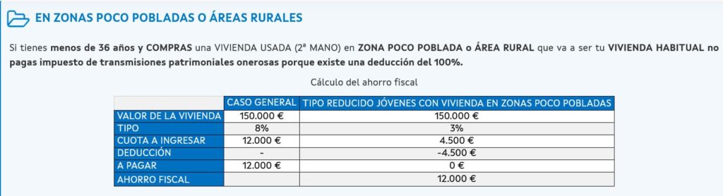3. Si cumples los requisitos y eres menos de 36 años y COMPRAS una VIVIENDA USADA (2ª MANO) en ZONA POCO POBLADA o ÁREA RURAL que va a ser tu VIVIENDA HABITUAL no pagas el impuesto de transmisiones patrimoniales ITP onerosas porque existe una deducción del 100%. el joven puede beneficiarse de las ventajas fiscales para la adquisición en el rural gallego: 0% (Para jóvenes en parroquias/núcleos rurales específicos) = 0€. Enlace Axencia tributaria de Galicia